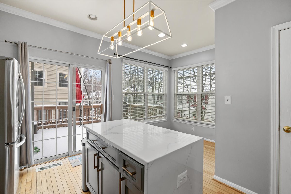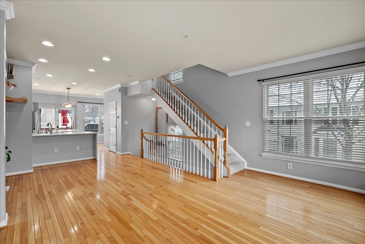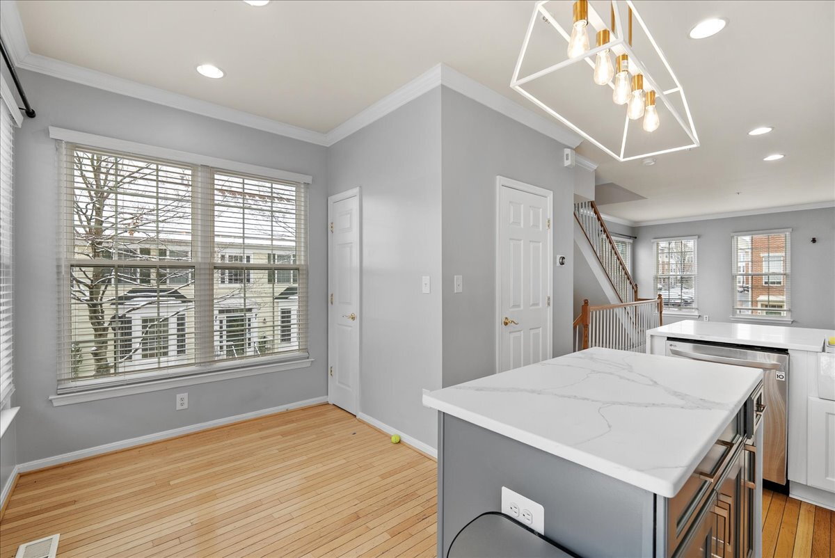 The main level features warm wood floors and inviting living spaces that flow seamlessly from room to room. The well-appointed kitchen includes ample granite counter space and stainless steel appliances, and it opens to a dedicated dining area that’s perfect for everyday meals or entertaining.